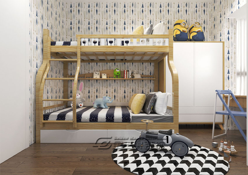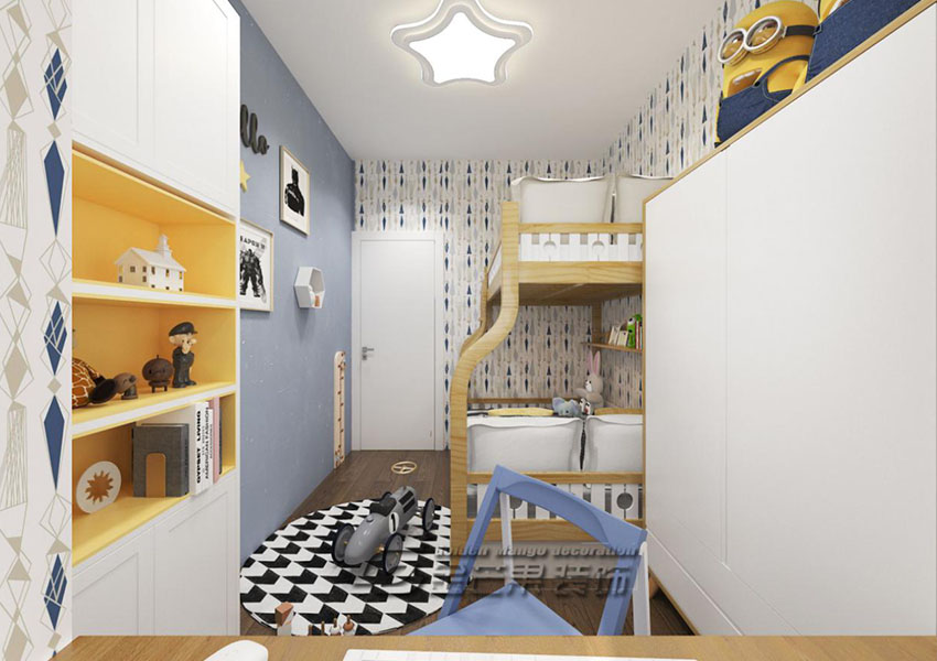 兒童房選用實(shí)用性強(qiáng)的高低床,純凈的淺藍(lán)色背景和活潑的 背景形成鮮明的對(duì)比。隨處可見(jiàn)的布偶和玩具是孩子快樂(lè)成長(zhǎng)的心靈寄托。