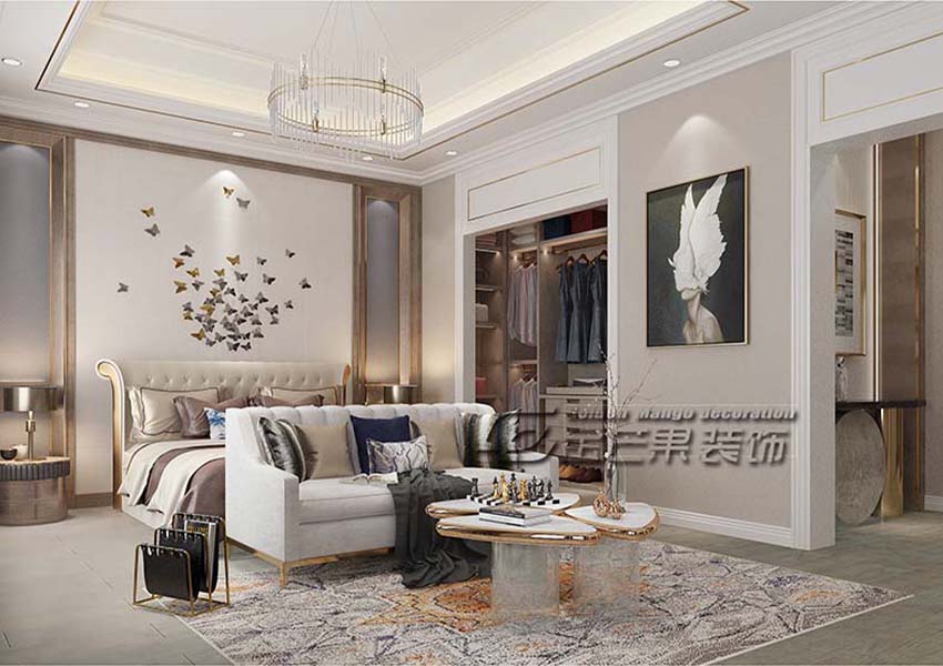 臥室極力打造一個個人的私密空間,融入衣帽間、衛生間相互之間的影響更小,空間上更寬敞,床頭墻壁上的蝴蝶,增加浪漫的色彩,吊燈充滿著強烈的設計感。