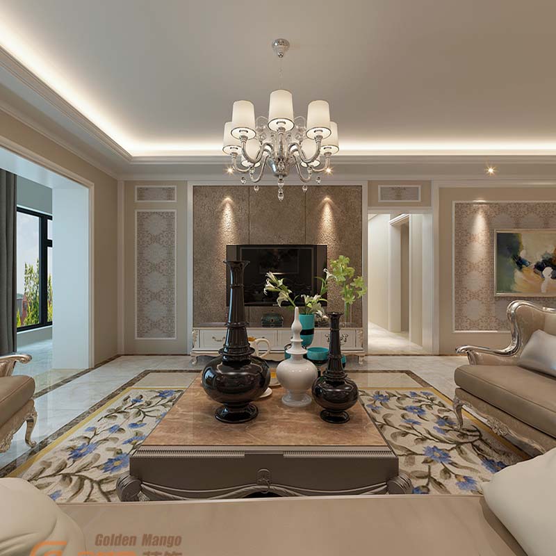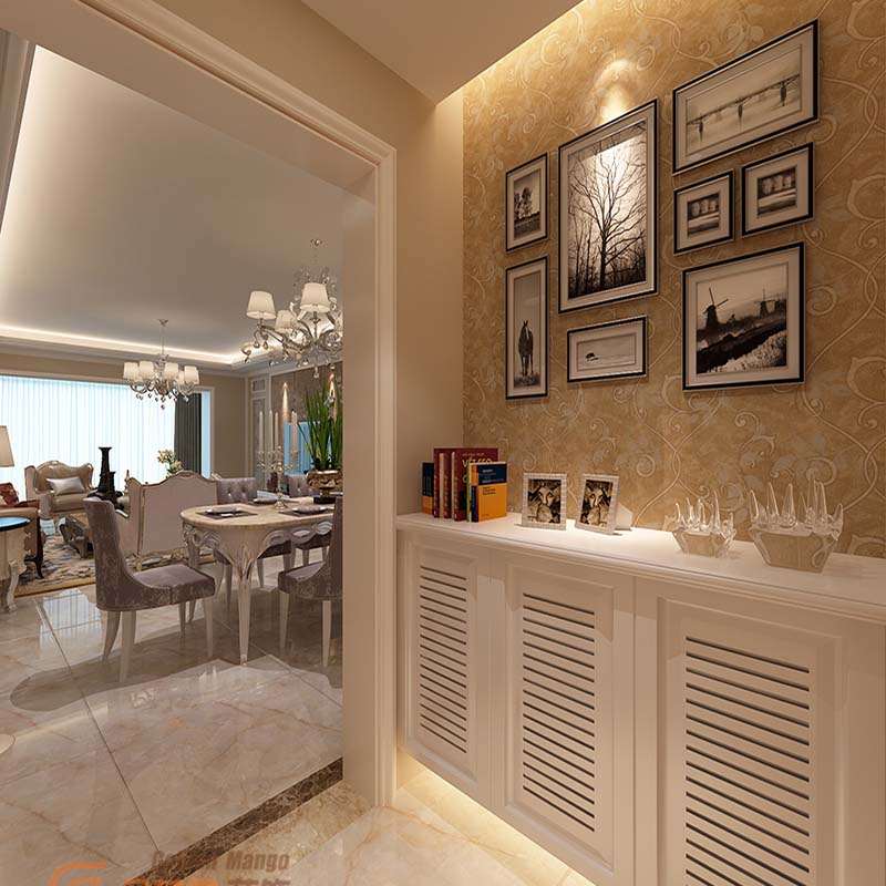 墻面用花紋豐富壁紙裝飾,表現(xiàn)出優(yōu)雅品質(zhì)的感覺。吊燈以它優(yōu)雅的身姿詮釋著它的美,茶幾上個有較高收藏價值的飾品花瓶,幾只花自然清新。