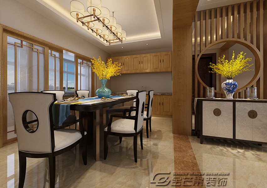 廚房、客廳、餐廳之間沒有明顯的隔斷,家庭之間的聯系性更好。開放式的廚房,大理石的操作面,木質的櫥柜,別具一格的格調。柜體貼心,隨時隨地儲藏著你所需要的一切。餐桌和椅子則是經典的中式元素。兩個花瓶詮釋著來自遠方的美。