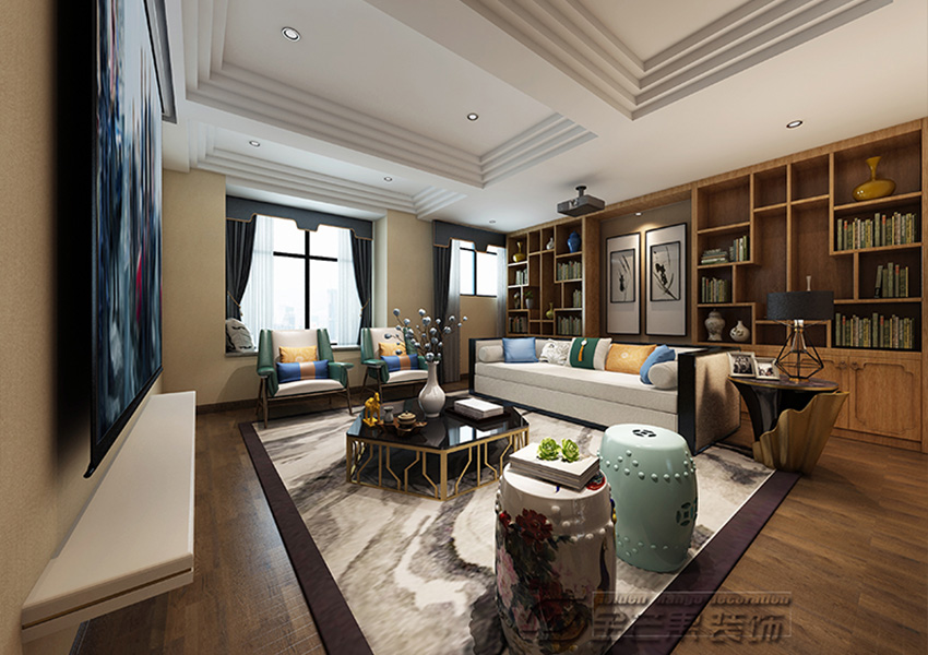 強烈的線條元素,打量、裝點著客廳。更多的是現代元素和中式元素的搭配,時尚、前衛。關上燈就是來自影院級大銀幕的視覺體驗,天花板上層次鮮明、粗礦的線條空間感更加強烈木質地板總能給你帶來貼心的溫存。