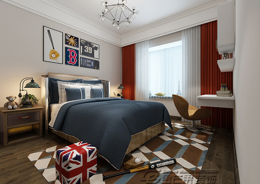 大膽的設計,暗色和亮色的搭配,一冷靜、一強烈。鮮明的對比也是屋主人極具個性的體現。英倫色彩的方凳,和美式的棒球。鮮艷的紅色窗簾,向往著熱血、陽光。