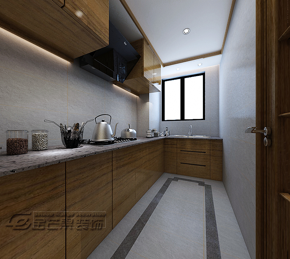 廚房,梨木色的柜體眼前一亮,黑色的油煙機科技感爆棚,窗子設計的高度擁有更好采光性,柜體下方燈帶的設計更顯得細心和貼心。動線合理增加烹飪的效率,同時容納兩個人也不懼壓力。