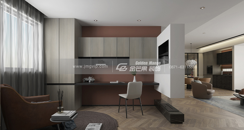 磚紅色和梨木色相搭配,意境十足。客廳、餐廳、書房的布局,空間感覺更加強烈。客廳面積寬大的地毯也保證了舒適性。頂上星星點點的射燈,加上燈帶的設計顯得空間上更具有穿透力。