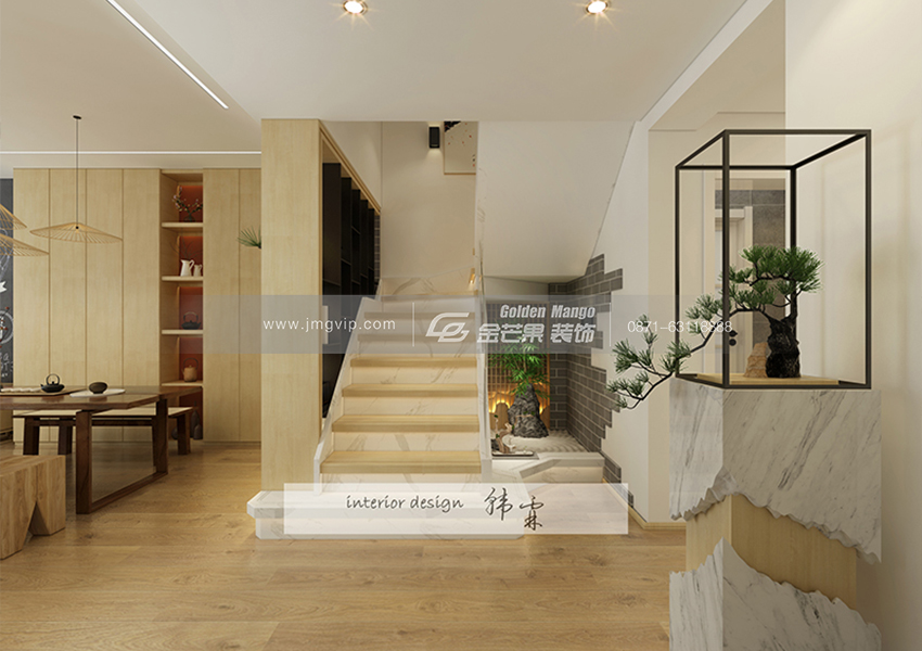 好客之心永存于心,對客人的尊重總是體現在方方面面,被珍藏的迎客松就是最好的體現,被撐裂的底座有樹木茁壯成長的意味,更有共勉之意。樓梯下面也是一個小的生態圈,樓梯巧妙的和整體相搭配。