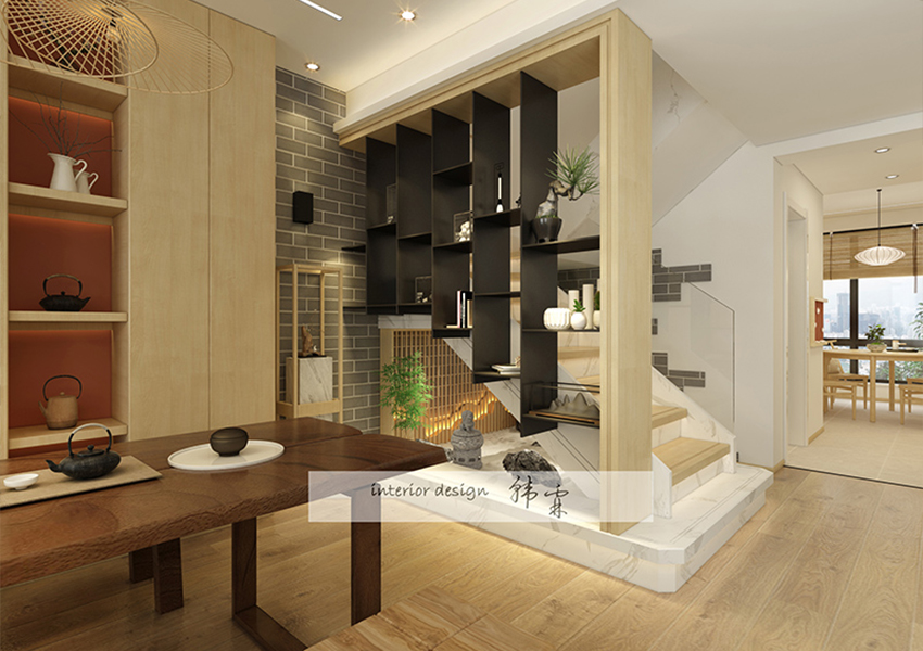 樓梯的一面采用鏤空的設計,減少了上樓時的壓抑感覺,客廳、餐廳、品茶區之間沒有隔斷的處理,提升整體的聯系性。