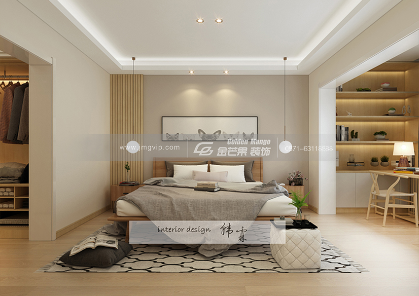 簡單才是生活的本真,木材提升著生活的質感,床頭兩個落地吊燈顯得設計感十足,床頭的掛畫則體現著強烈的西方色彩,在風格上也有中式和北歐風格的相融合,其結果不僅是傳承,更是對舒適度的提升。打造一個獨立、私密的個人空間。