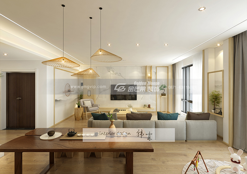 客廳的茶幾和品茶區擺放的茶具,是屋主人好客的體現,木質的柜體順應了整體的風格,稍顯深邃的工業風格背景墻,品茶區和客廳的連接,聯系性強,設計感強烈的吊燈也成為了顏值擔當。