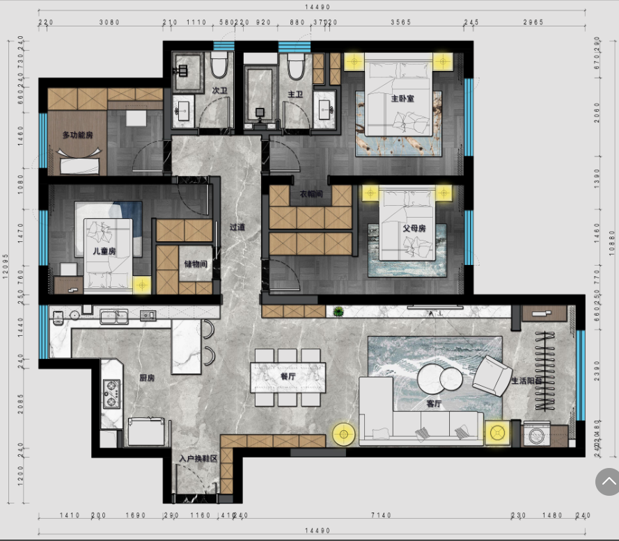 結(jié)合次臥大于主臥和業(yè)主儲存空間太小的需求,設(shè)計師在父母房、兒童房、多功能房都設(shè)置了大量的儲物空間,實用而減少空間浪費。