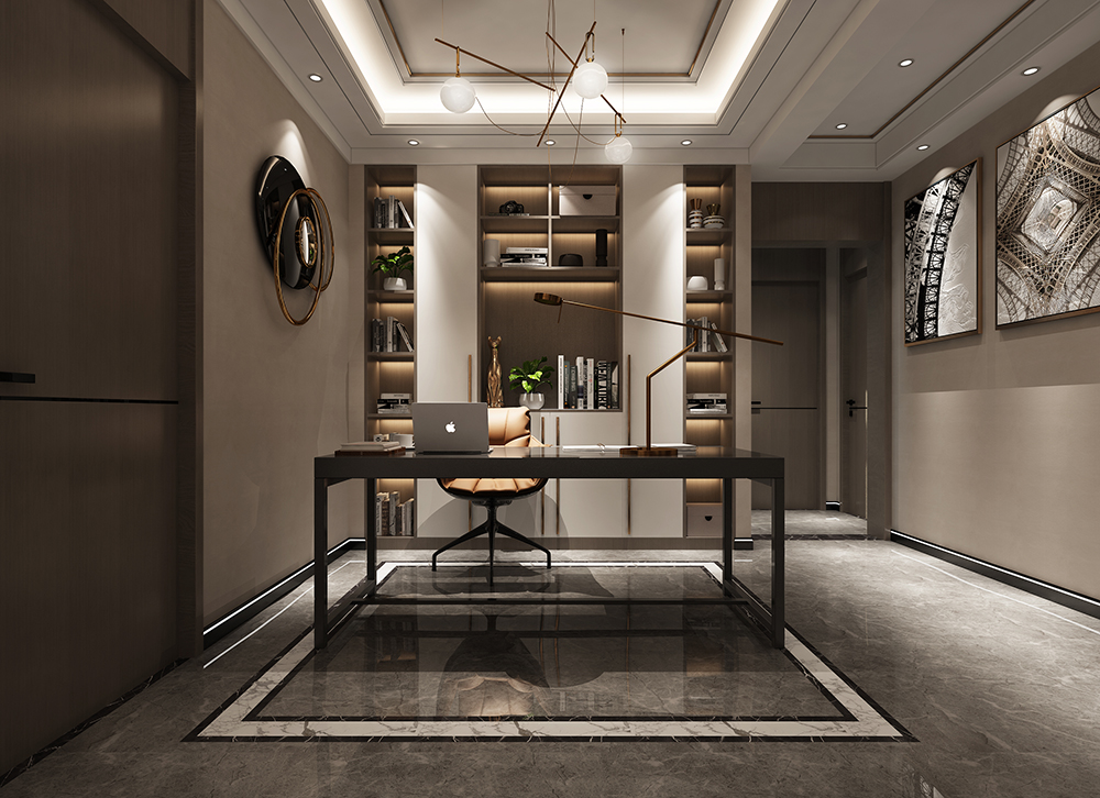 開放式書房滿足業(yè)主需求。白色柜體中和了暗色調(diào),增加通透感,寫意裝飾畫增加藝術(shù)氣息。整體空間是 一個沉靜的、利于思考的氛圍。