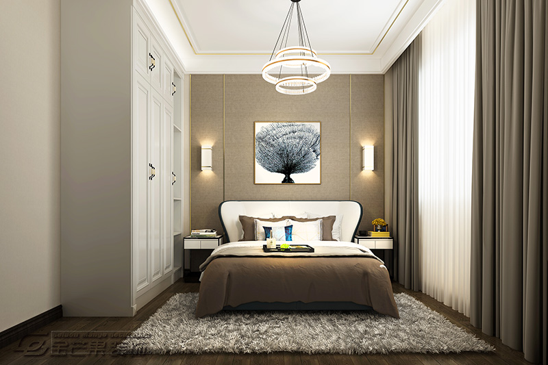 毛絨地毯,空間感極強的吊燈更顯驚艷,咖色的被褥更親膚,兩條金屬線條撐起房間的奢華和優雅。壁燈的布置盡顯格調,定制柜體最大限度增加儲物空間,整體空間利用率更高。