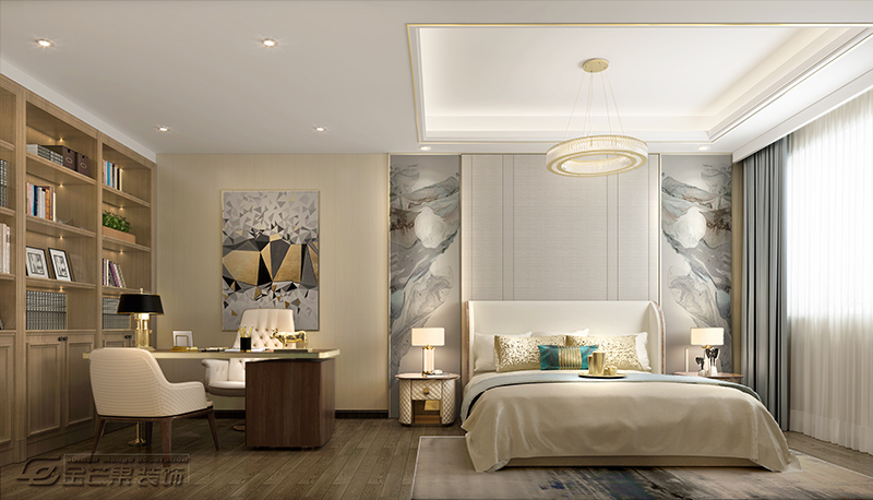 主臥在設計上,融合了獨立的辦公區。風格上顯得清新淡雅, 木質的地板,文藝氣息十足的藝術掛畫。溫和的燈光更適合休息入睡,承載著滿滿的美夢。