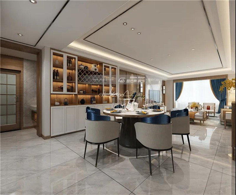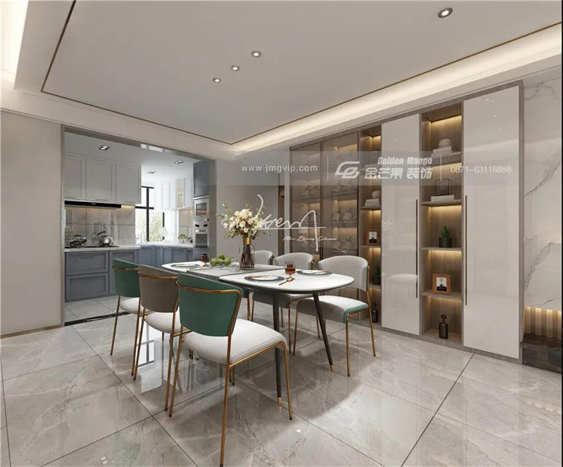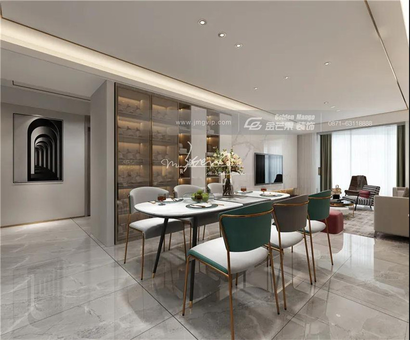 金屬元素的運用,輕松打造高級時尚感,精致而充滿氣質,旁邊的紅酒柜和餐桌椅搭配得相得益彰,讓生活充滿儀式感。