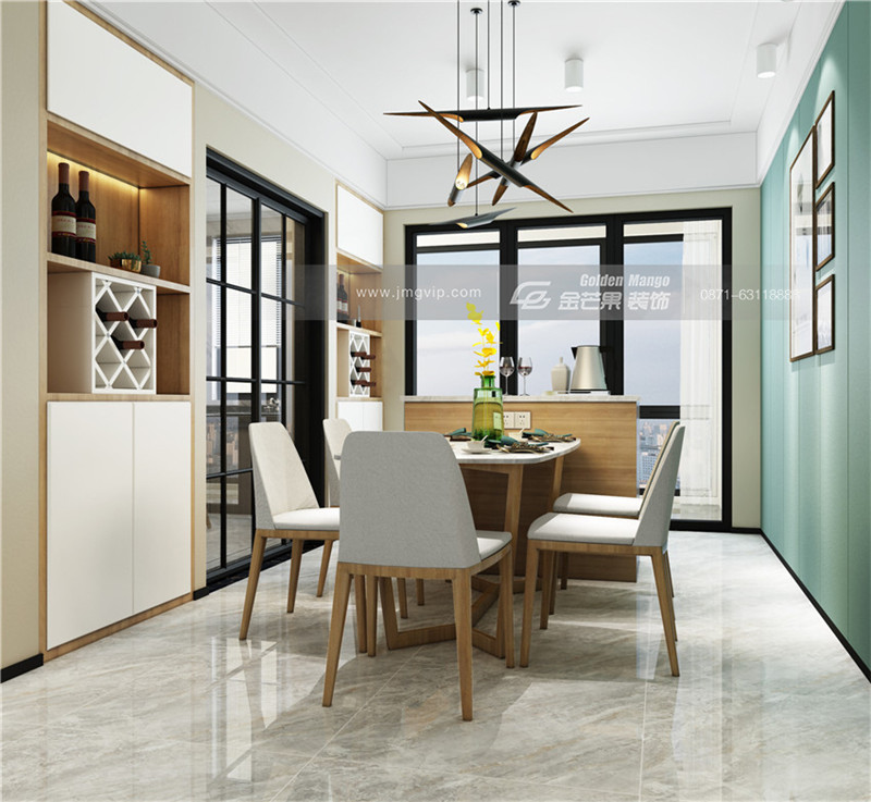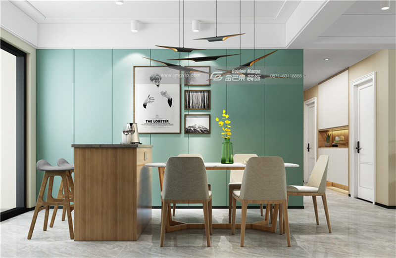 大量原木家具的運用,讓用餐空間寧靜且放松,簡潔的燈飾和柜體符合整體空間簡約、寧靜的美感,輔助光源投下溫柔的光線,細細品味生活的幸福滋味。