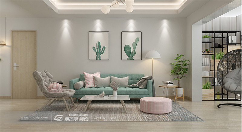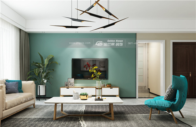 綠色的墻體給人帶來強烈的視覺沖擊,點綴顏色稍亮的抱枕、座椅,優雅但不沉寂,清高但不傲世。點綴清新綠植,一花一世界,隱有暗香浮來,便如置身四季。