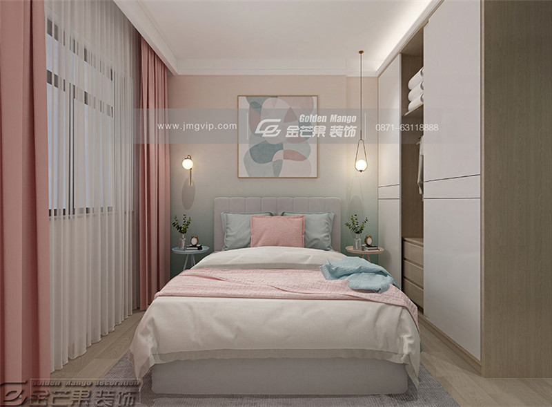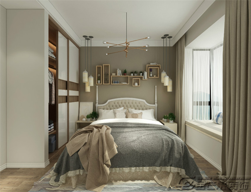 床頭置物架既實用又美觀,飄窗讓房間多了一塊休閑區域,營造舒適的休息空間。