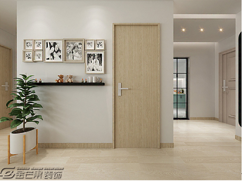 入戶門廳設置兩個原木儲物柜,提供小戶型需要的大量收納空間。