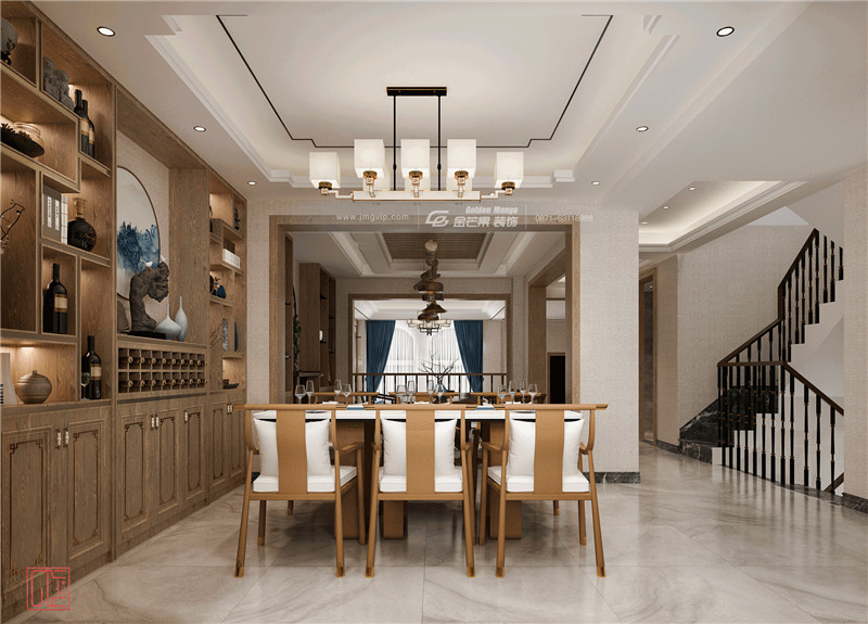 原木的餐桌椅、餐邊柜,其間點(diǎn)綴藍(lán)色山水畫,清麗婉約,炫中出素。紅酒和青瓷,一中一西,碰撞出個(gè)性獨(dú)特的設(shè)計(jì)感。