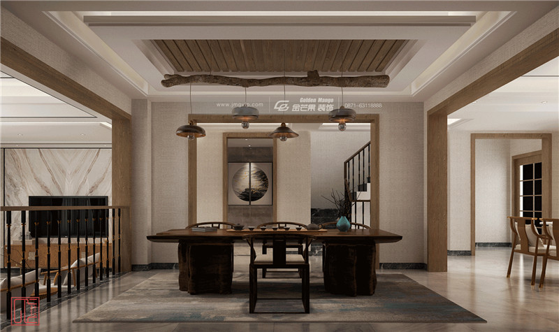 繼續(xù)沿用大量的原木家具,架上藏納古物雅玩,木材保留原始紋理的質(zhì)感,營造充滿書香氣的雅致空間。