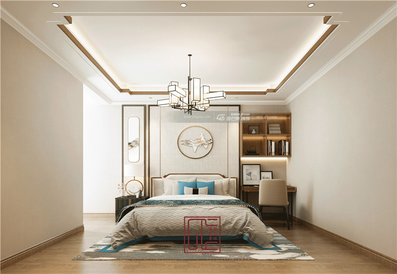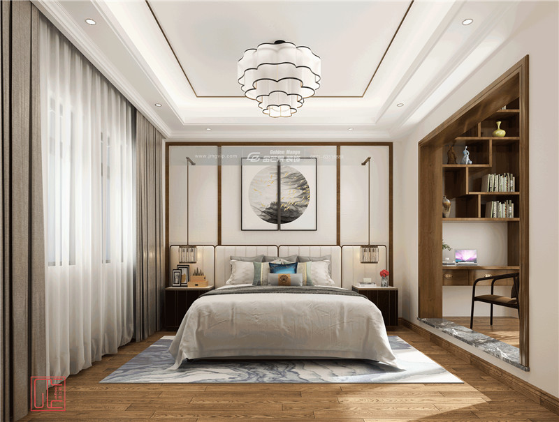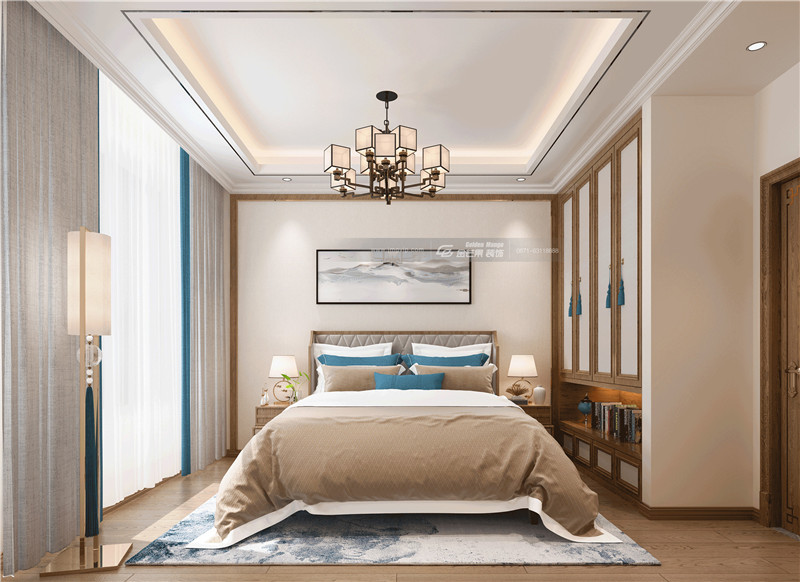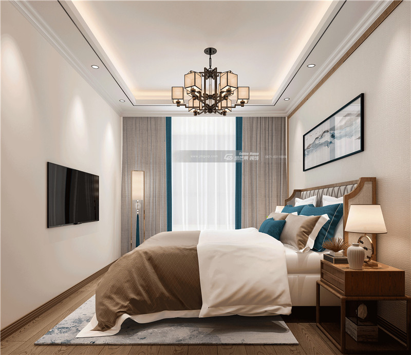 中式家具線條運(yùn)用鑲金渡邊的設(shè)計(jì),將中式傳統(tǒng)之美與現(xiàn)代經(jīng)典時(shí)尚之美相結(jié)合,貴氣優(yōu)雅。床頭設(shè)置吊柜,豐富空間層次,兼具實(shí)用性。