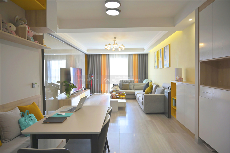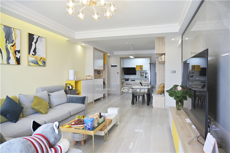 另外,這套房子是夫妻兩人的二人世界,選用了大量靚麗的色彩,比如說黃色的沙發(fā)背景墻,這樣柔和的色彩能起到讓人放松的作用,也能讓整個房間看起來更加溫馨、明媚一些,就像愛情溫暖、美好的模樣。