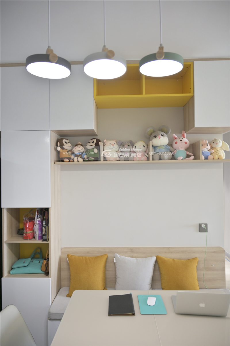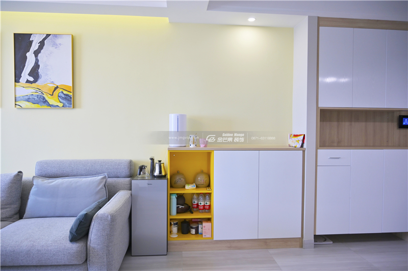 用明黃色的柜體區(qū)塊來中和淺色系,有主有次,有輕有重