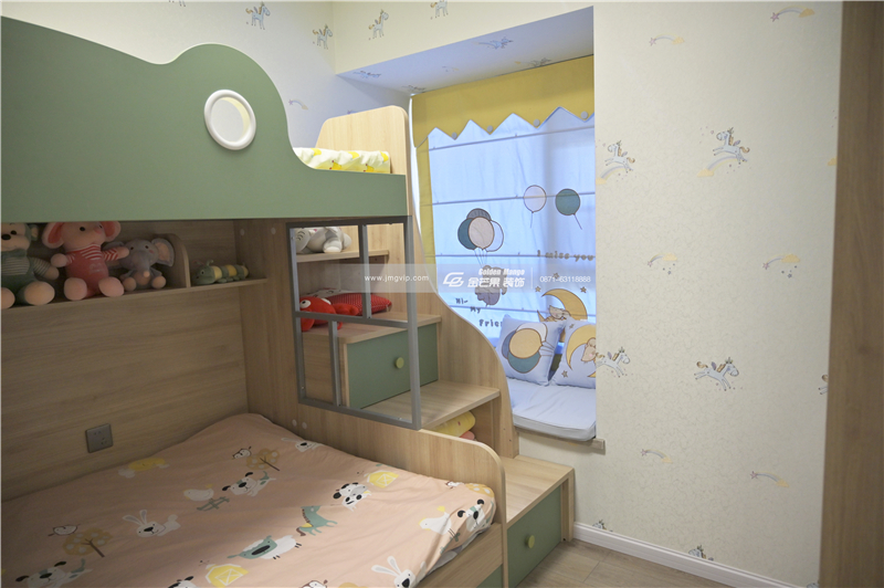 這套房子夫妻兩人預(yù)留了一間兒童房,嫩綠、嫩黃是和整個空間格調(diào)相協(xié)調(diào)的,也保留小孩子純真、可愛的童真。墻紙選用也是有卡通圖案的,充滿童趣。上下床節(jié)省空間且很實(shí)用。