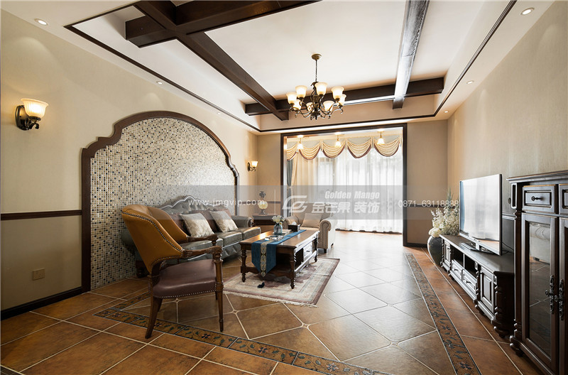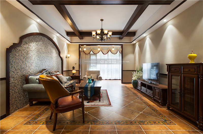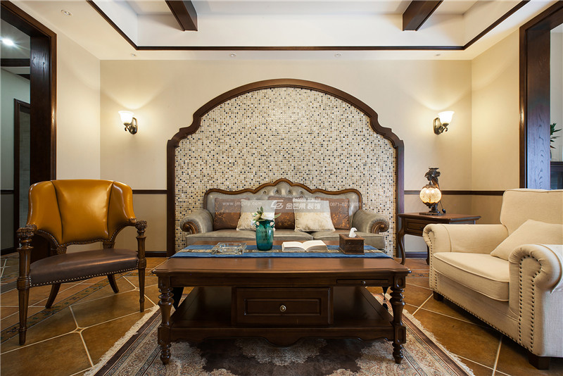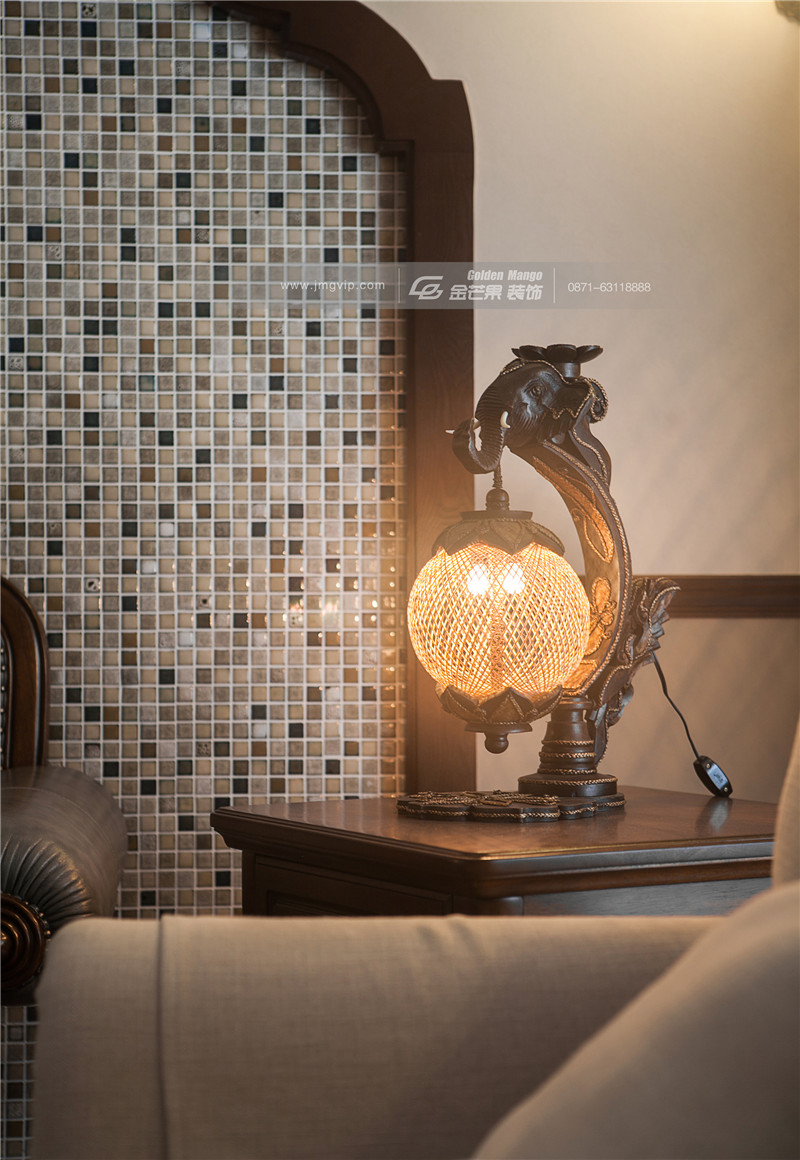 馬賽克沙發背景墻跳躍的顏色讓整體空間活潑了起來,石材是冷靜、利落,木材是溫厚、舒心,一剛一柔,碰撞出個性、豐富的空間感。