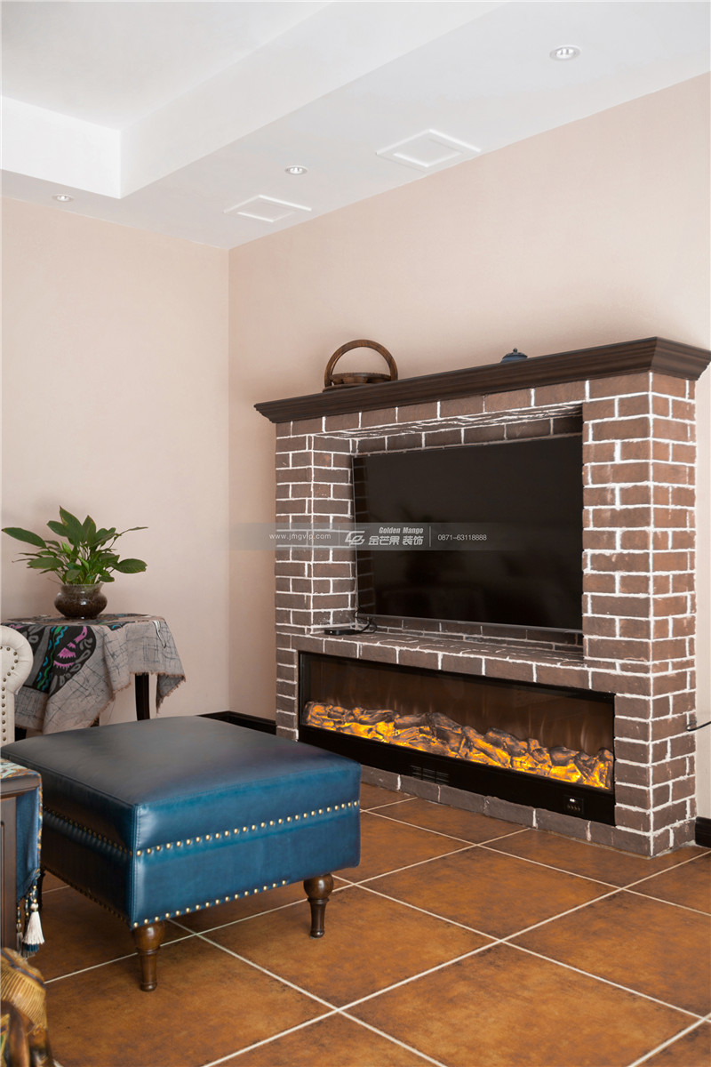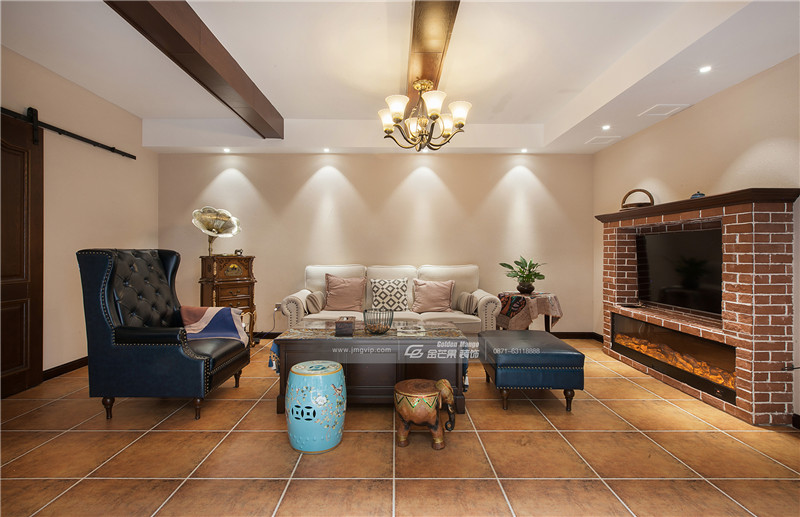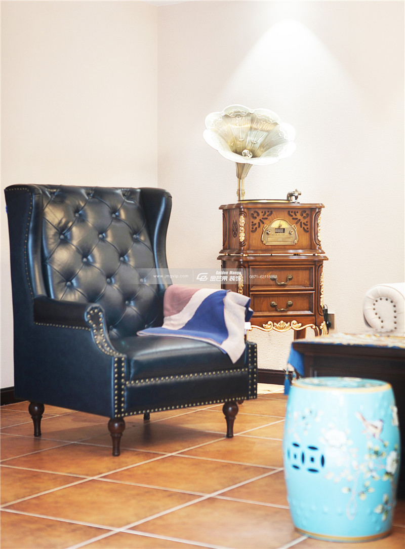 在復古氛圍的基礎上加上了現代的元素,粉嫩的顏色為空間注入了一絲清爽的氣息,墨藍的沙發彰顯別樣的浪漫與優雅。藍色的鼓凳清新、經典。