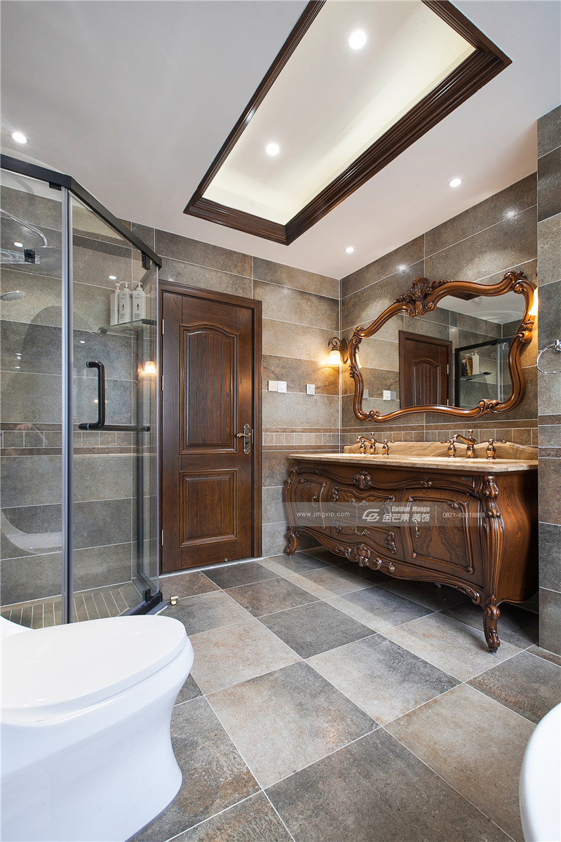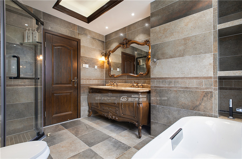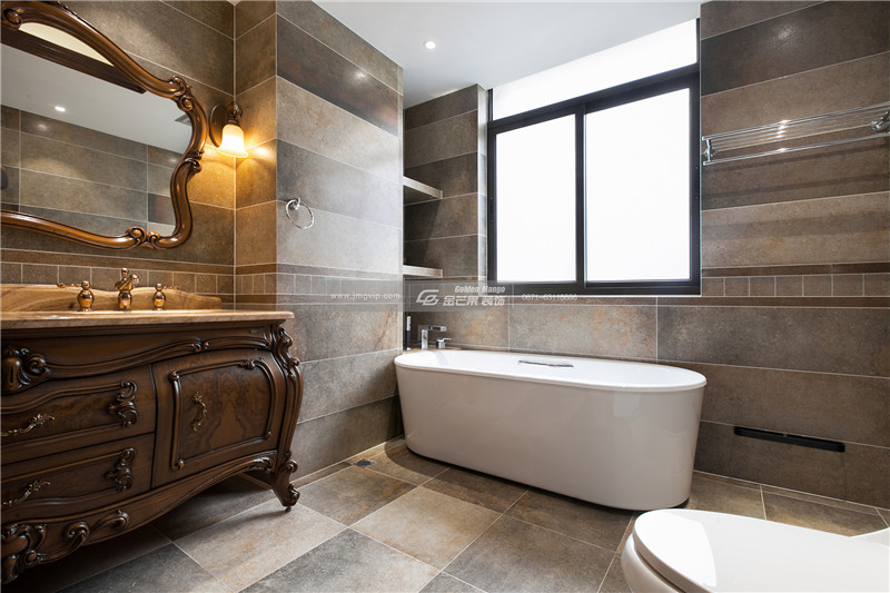 仿古磚上墻,雕花復古的臺盆和鏡子營造高級的奢華感。
