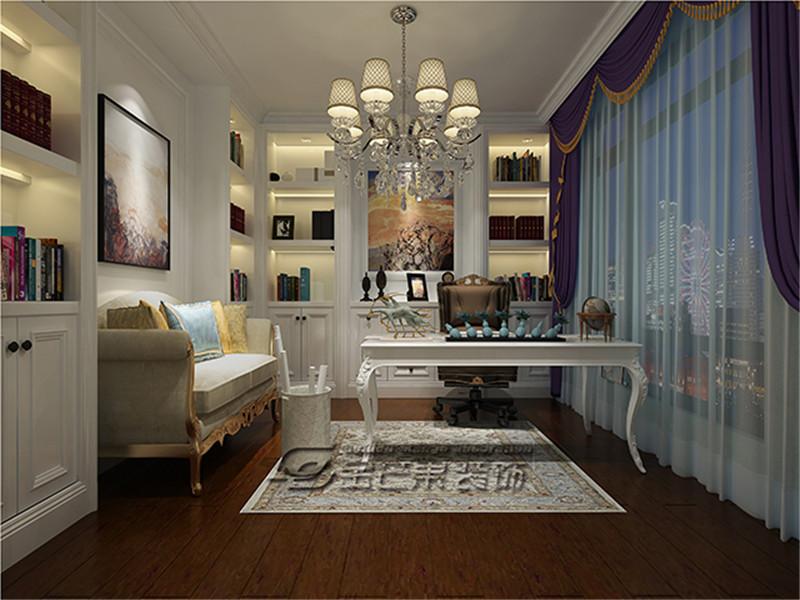 書房采用了大量中式元素,非常有設計感的鳥籠型狀的吊燈也非常能體現中國風的元素,與墻上的裝飾畫實現了中西碰撞。