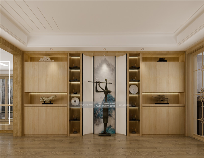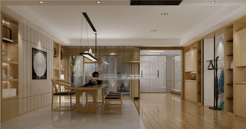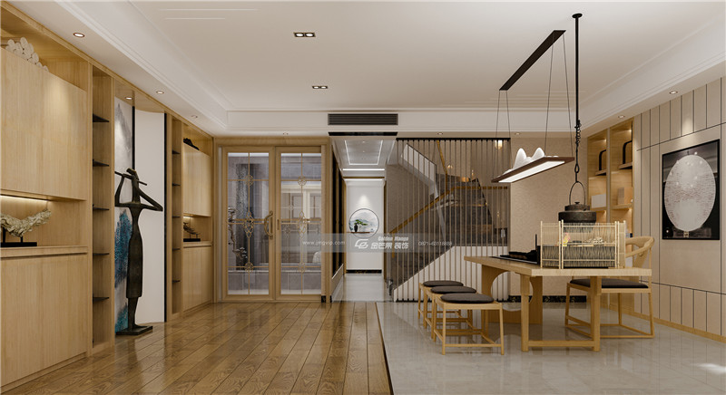 運用大量原木家具,打造雅致秀麗的中式氛圍。運用地板的材質作出空間隔斷,形成一種相互呼應、相互補充的空間美感。