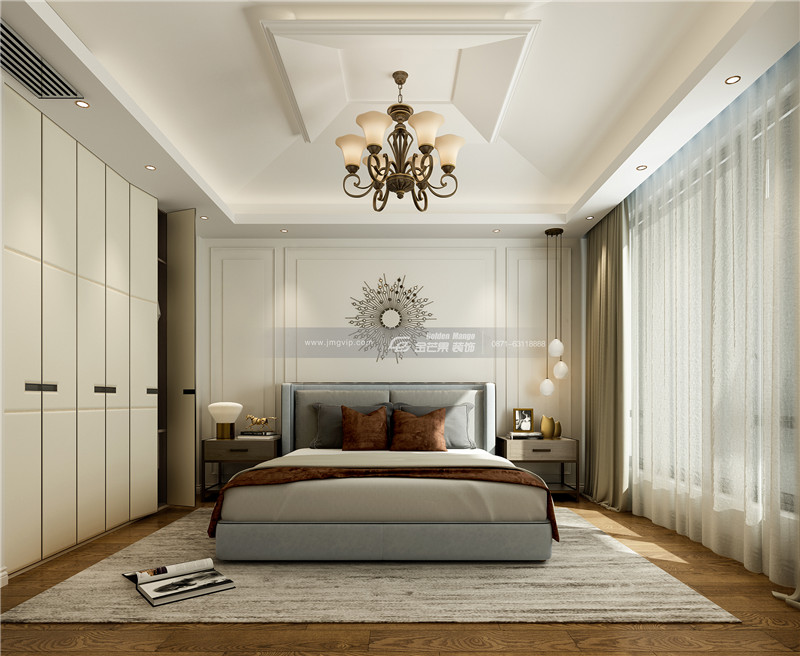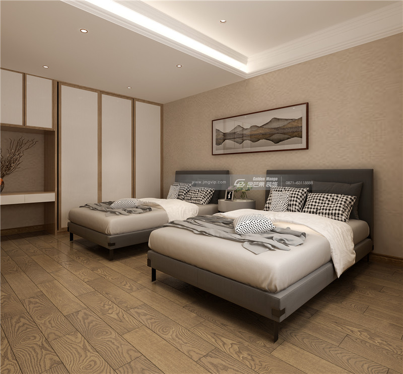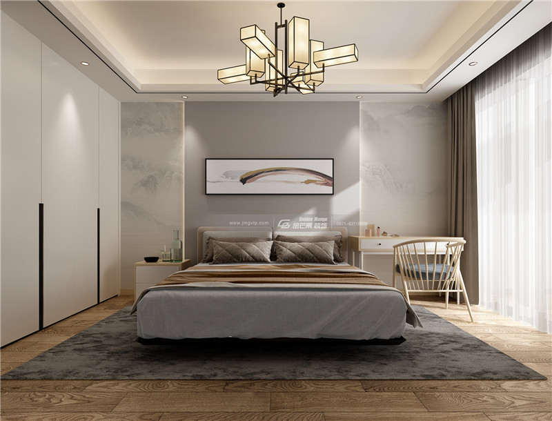 床頭背景墻蘊藏巍峨的群山,似有若無,營造寫意的美感。