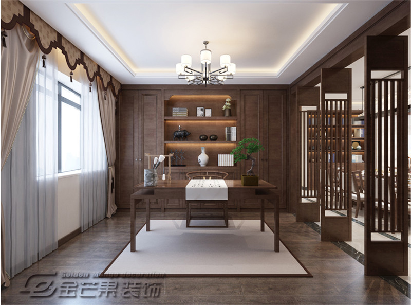 原木書柜和書桌椅在打造古色古香的氛圍,一些瓷器、筆架、迎客松等都非常具有中式特色。對稱的書櫥也呈現出一種對稱美,包括屏風的運用也是很有中式之美。
