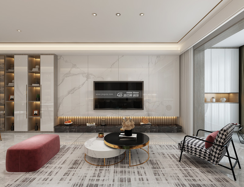 電視背景墻一整面的石材簡潔、大氣,黑白的搭配加上輔助光源的加持,讓家居氛圍更顯溫馨。