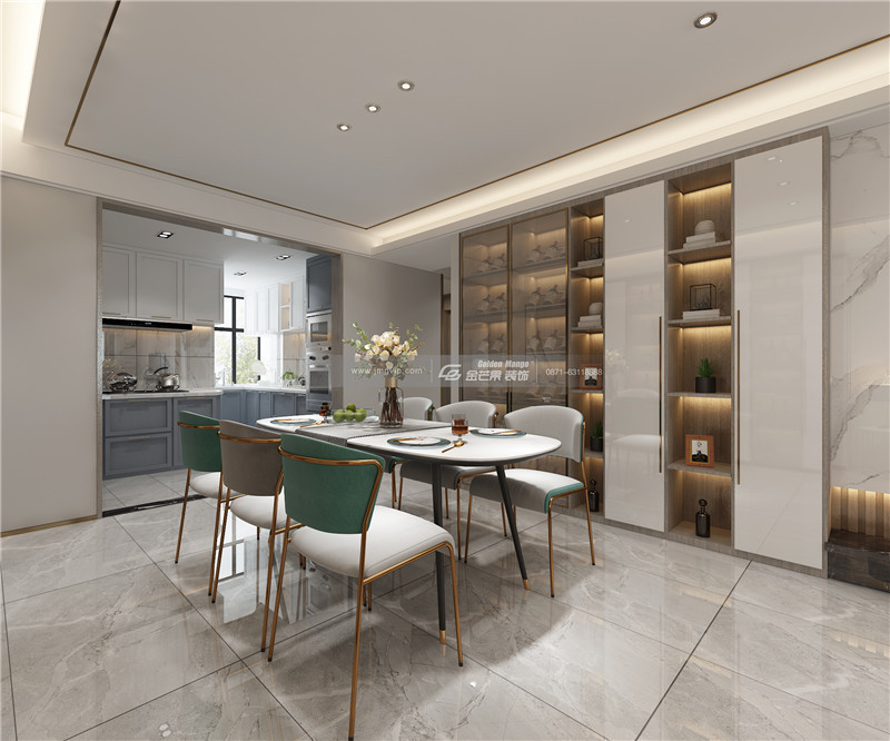 寬闊的餐桌椅和餐邊柜可同時容納多人就餐,承載下一家人的幸福時刻。餐廳的溫度也是一個家的溫度,餐廳與客廳風格協調融合,精致的用餐空間許一份生活的美好。
