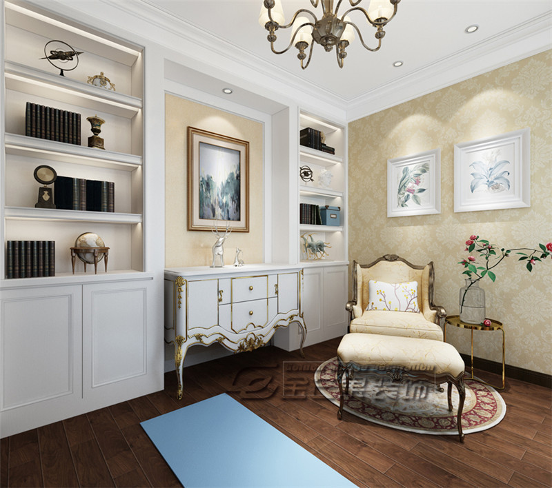 白色的書柜和展示架搭配優雅的壁紙,干凈又不失品味,金色的鑲邊和白色的家具搭配高貴優雅。歐式的椅子和歐洲風情的地毯搭配得恰到好處,金色的鐵藝架和一只優雅的鮮花,充滿了歐洲浪漫風情。