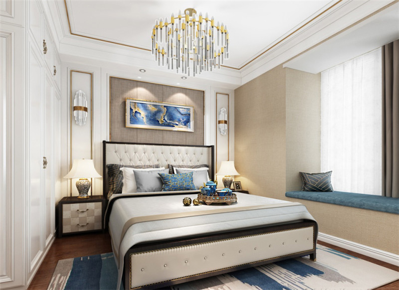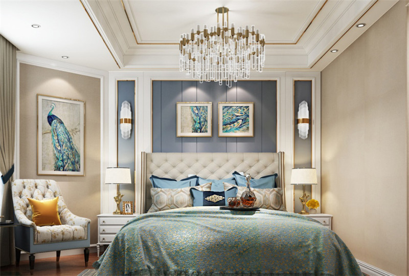 墻上的裝飾畫清新、時尚,使空間更加活潑。歐式的家具和鍍金鑲邊的吊頂、時尚的吊燈,營造奢華的感覺。