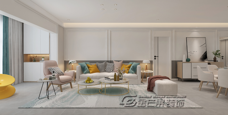 沙發(fā)背景墻以暖白色為主,凸起的方形石膏線(xiàn)條走邊讓普通墻體瞬間高級(jí)起來(lái);暖白色沙發(fā)上井然有序的擺放著莫蘭迪綠,橙黃,皮粉等色彩明艷的抱枕作為點(diǎn)綴。吊頂邊緣嵌入式暗燈帶的設(shè)計(jì)使得客廳明亮通透,光線(xiàn)柔和不刺眼。