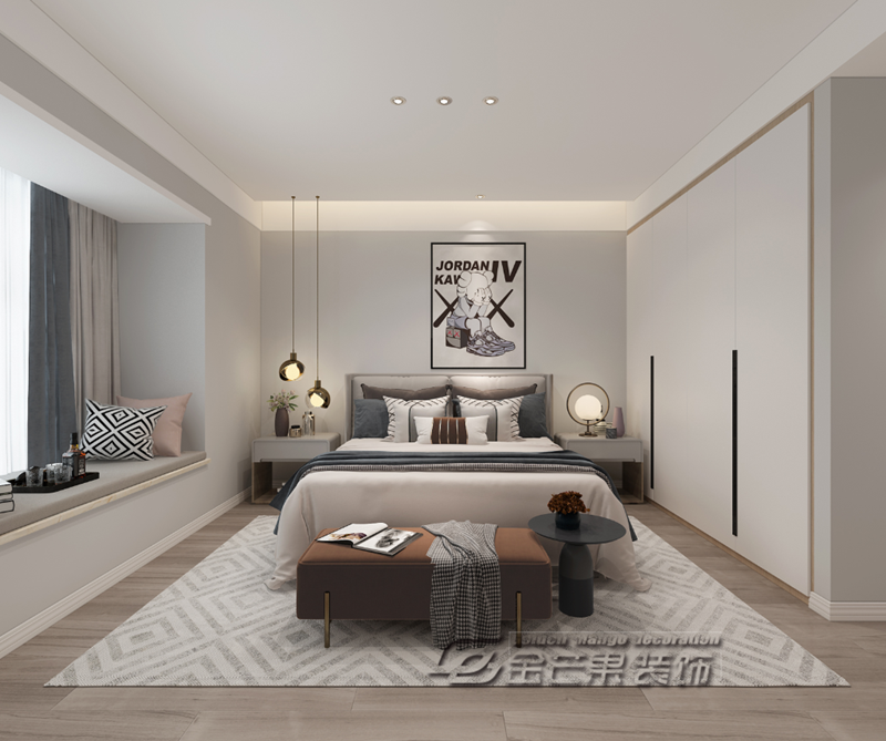 主臥的設(shè)計(jì)以灰白色為主要色調(diào),咖色的沙發(fā)和色系飽和度略高的的飾品做為點(diǎn)綴。兩側(cè)床頭柜設(shè)計(jì)感十足,簡(jiǎn)約的飾品凸顯高級(jí)與質(zhì)感;采用間接照明,保證睡眠質(zhì)量,左側(cè)床頭柜垂立而下的吊燈讓臥室具有簡(jiǎn)潔明快的層次感,與右側(cè)床頭柜上的臺(tái)燈呼應(yīng)出不對(duì)稱(chēng)的美感。與主衛(wèi)之間做了一組雙面衣帽柜,很大程度上滿(mǎn)足了儲(chǔ)物需求。