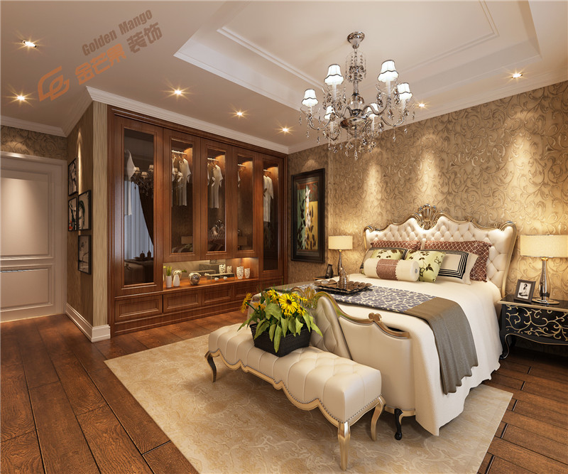 歐式的床具吊燈搭配棕色的家具,歐式花紋的壁紙營造尊貴典雅的氛圍,低調(diào)舒適,透明的衣柜門時尚大氣。
