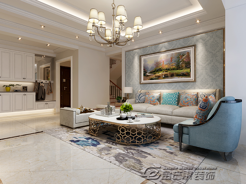 整體空間以象牙白為主色調(diào),搭配藍、白色調(diào)的家居和窗簾,雅致清新。鐵藝家具的運用在歐式風格的打造中非常常見,鍍金鑲邊的家具增加奢華、浪漫的氛圍。異域風情花紋抱枕和個性化設計的茶幾令整個空間更優(yōu)雅,提升檔次。