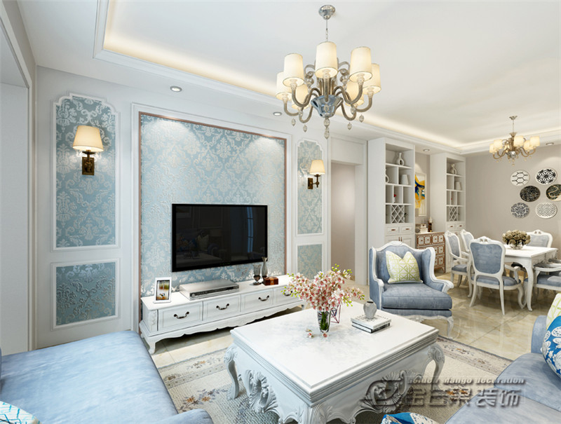 整體空間是以藍白色調為主,打造清新、優雅的北歐風。歐式的家具搭配藍色的壁紙,優雅又有格調。白色和藍色碰撞出不一樣的火花,歐式的華貴優雅和藍色的沉靜大氣互相綜合,打造有格調又氣質舒適美家。