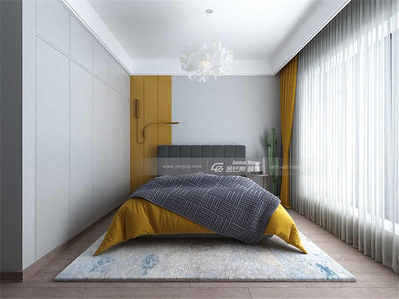 沉靜的藍色搭配幾抹黃色,沉靜雅致,穩(wěn)重不失活潑。優(yōu)雅的燈飾輕盈有氣質,中和了直線條帶來剛硬感。