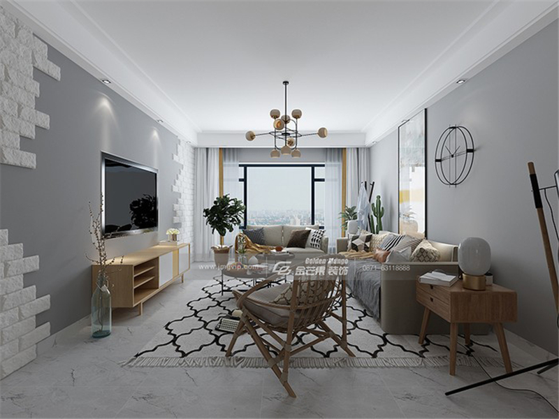 沉靜的顏色搭配防磚的電視背景墻,凸顯質樸的氣息,但因為選用的是白色的色調,高級感更顯。地毯花紋更加靈動,和沙發(fā)背景形成了一個呼應。