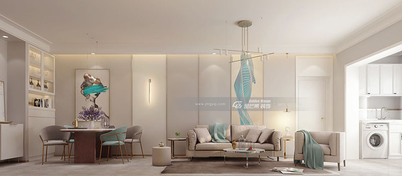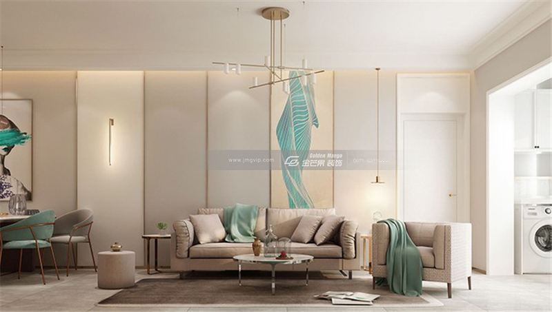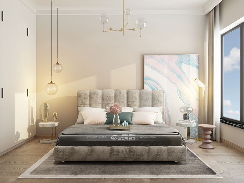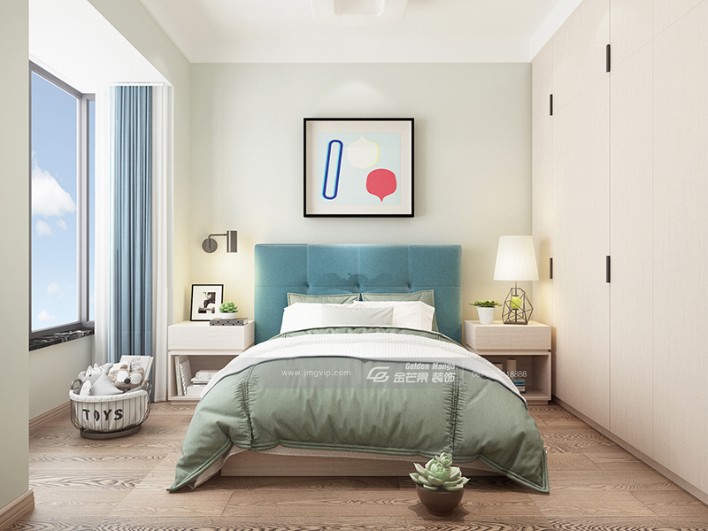 入眼即是舒適的感覺,純凈的白色調就像是海邊純潔的沙灘,仍不住讓人想放空。背景墻深淺不一的顏色突出層次感,藍色掛畫似蜿蜒的海水,清涼潔凈,又像是水中穿梭的魚兒,活潑靈動。