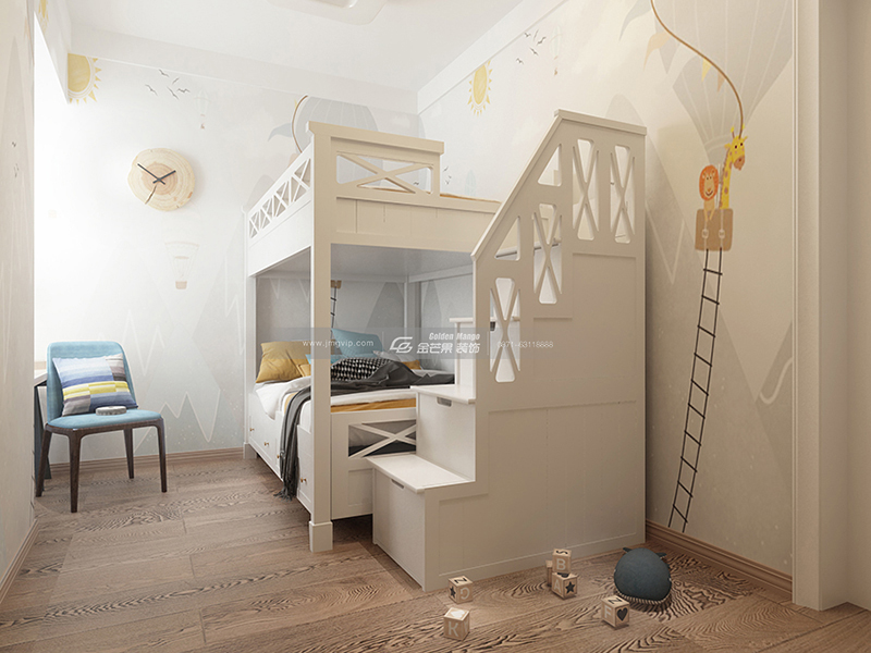 童趣滿滿的兒童房,鋪滿墻的墻紙不規則的裝飾帶來不期而遇的驚喜,陽光、海浪、貝殼,仿佛都有了生命,開啟一場有趣的對話。