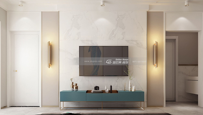 電視背景墻藍白相間的色調既優雅又清麗,暗色的花紋就如輕柔的水波,符合整體空間格調。