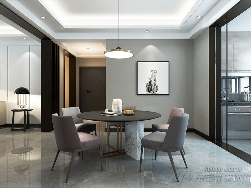 餐廳簡約吊燈設計,減少傳統(tǒng)吊燈對空間的壓抑和限制,餐桌椅與周邊一致的色系,讓區(qū)域更為統(tǒng)一。其中餐桌使用魚肚白石材與鎏金色幾何桌腿,蓋上黑色玻臺,碰撞出強烈的設計感。