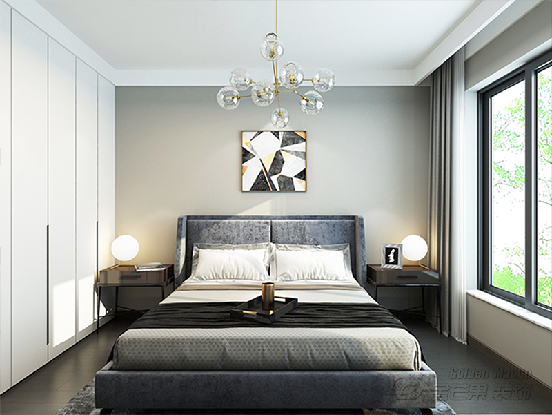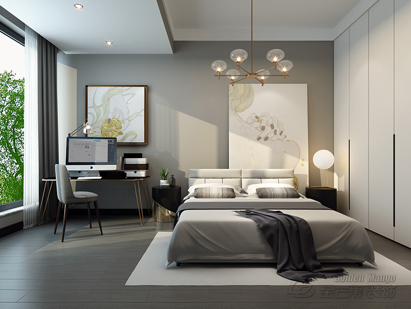 霧霾灰色的墻面和床具、黑與金的撞色床頭柜、墻面上一大一小暖白色的裝飾畫、鎏金色的泡泡吊燈,這些看似簡單的搭配,細節(jié)的處理卻頗有設計感。